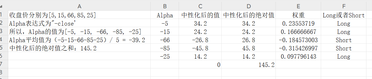 3.必做3:👉点击链接阅读:⭐ How BRAIN platform works | WorldQuant BRAIN,并回答以下问题:假设全市场共5个股票,收盘价分别为[5,15,66,85,25], Alpha表达式为“-close’(注意负号),在Neutralization Setting为Market的情况下,请回答这五个股票各自的交易权重(weight)为多少?long count 和 short count为多少(即有几个股票被做多,几个股票被做空)?